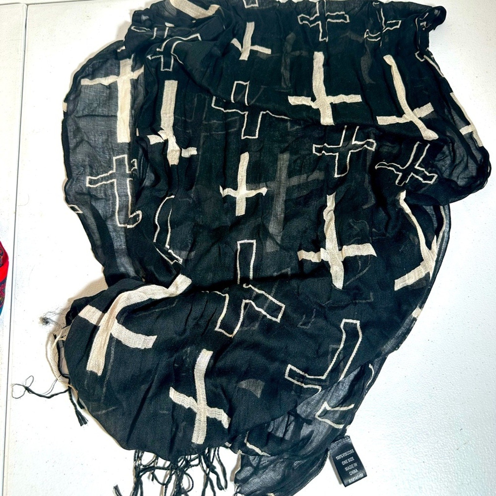 This lovely black and white scarf features a unique cross pattern that will add a touch of elegance to any outfit.