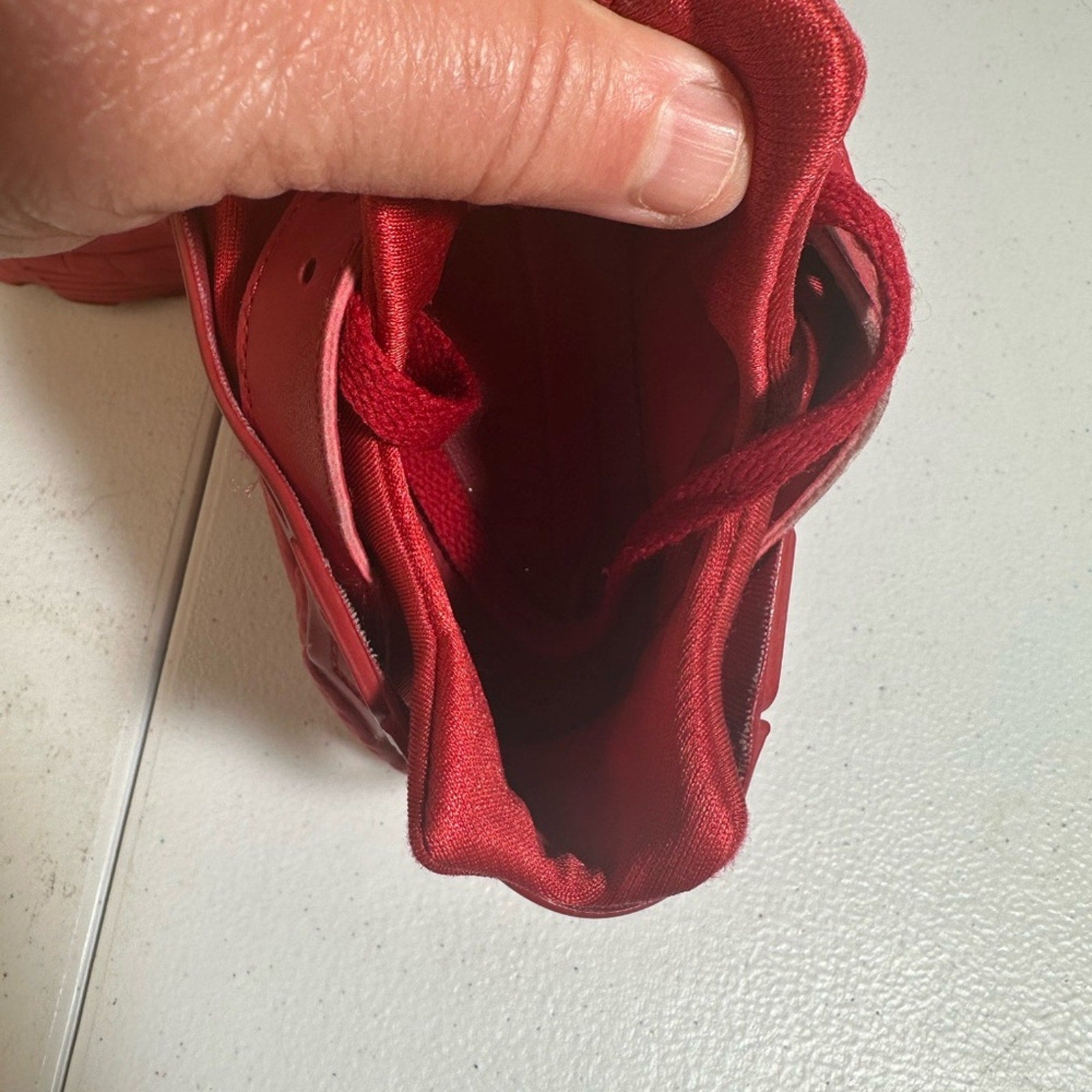 The varsity red leather top of the Nike Air Huarache Triple Red is complemented by red net console and water-resistant booties with a structure-adding exoskeletal cage. The sneakers also feature traditional red Air Huarache rubber soles and red polyamide heel straps. The sneaker's sculpted midsole contains encapsulated Air cushioning and features embossed rows of dots. It has a monochromatic finish. Finally, it displays an all-red outsole and a phylon midsole.